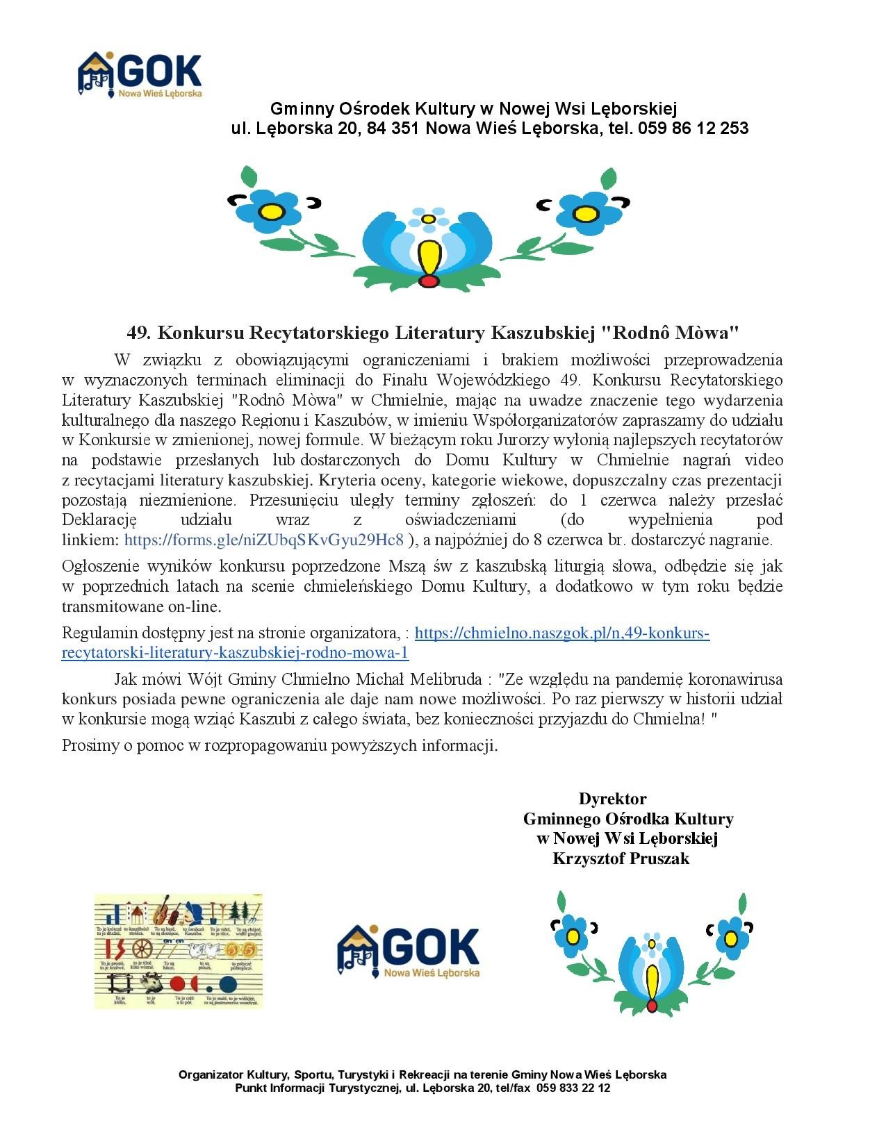 W związku z obowiązującymi ograniczeniami i brakiem możliwości przeprowadzenia w wyznaczonych terminach eliminacji do Finału Wojewódzkiego 49. Konkursu Recytatorskiego Literatury Kaszubskiej "Rodnô Mòwa" w Chmielnie, mając na uwadze znaczenie tego wydarzenia kulturalnego dla naszego Regionu i Kaszubów, w imieniu Współorganizatorów zapraszamy do udziału w Konkursie w zmienionej, nowej formule. W bieżącym roku Jurorzy wyłonią najlepszych recytatorów na podstawie przesłanych lub dostarczonych do Domu Kultury w Chmielnie nagrań video z recytacjami literatury kaszubskiej. Kryteria oceny, kategorie wiekowe, dopuszczalny czas prezentacji pozostają niezmienione. Przesunięciu uległy terminy zgłoszeń: do 1 czerwca należy przesłać Deklarację udziału wraz z oświadczeniami (do wypełnienia pod linkiem: https://forms.gle/niZUbqSKvGyu29Hc8 ), a najpóźniej do 8 czerwca br. dostarczyć nagranie.