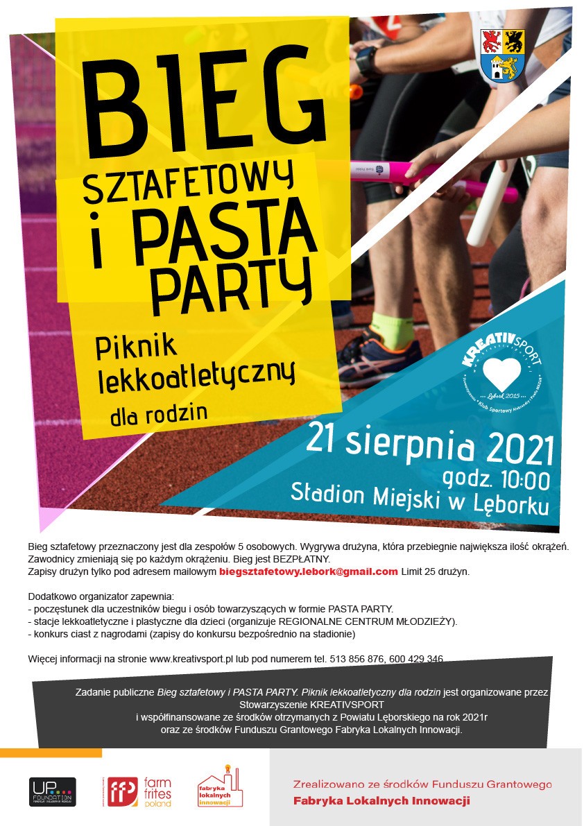 Bieg sztafetowy i PASTA PARTY. Piknik lekkoatletyczny dla rodzin jest współfinansowany ze środków otrzymanych z Powiatu Lęborskiego na rok 2021r oraz ze środków Funduszu Grantowego Fabryka Lokalnych Innowacji i składa się z: