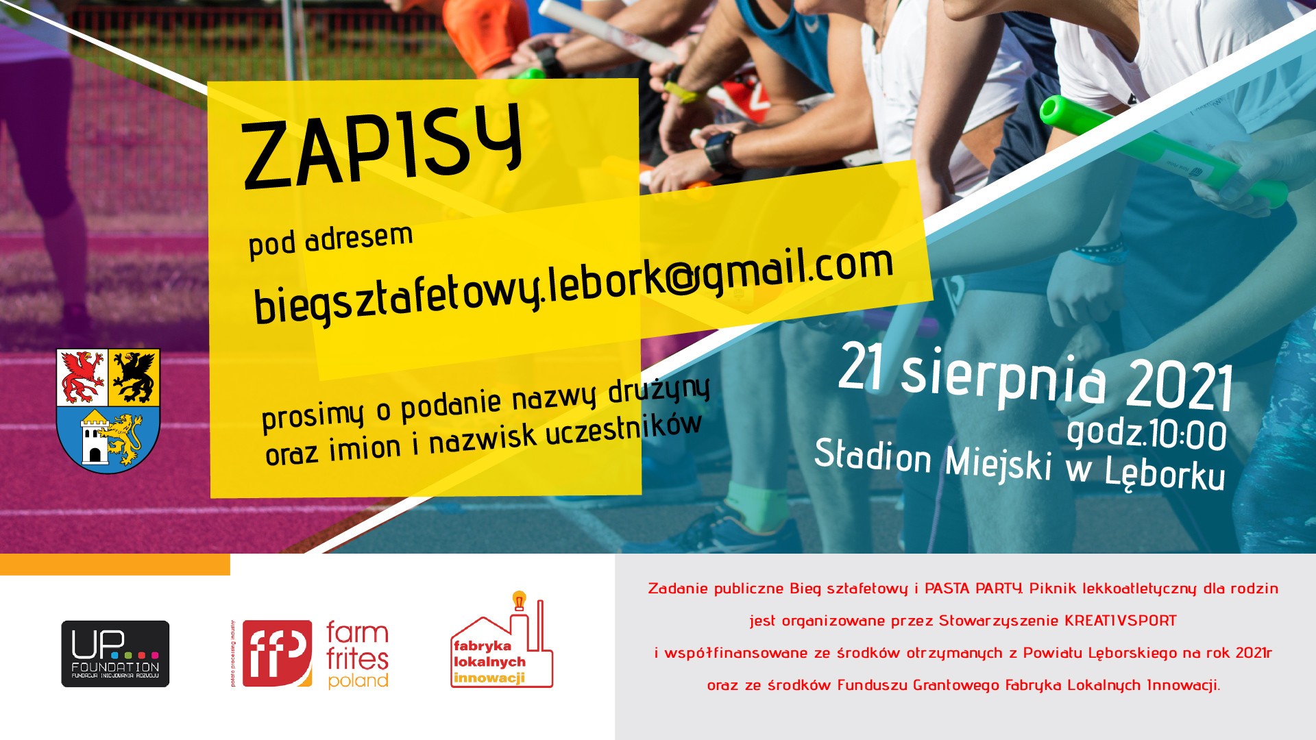 Stowarzyszenie KREATIVSPORT oraz Regionalne Centrum Młodzieży w Lęborku zapraszają na bieg sztafetowy i piknik lekkoatletyczny dla rodzin. 21 sierpnia, sobota, zapraszamy na bieg sztafetowy o godzinie 10:00. Stadion Miejski przy ul. Kusocińskiego 56. Wstęp WOLNY!