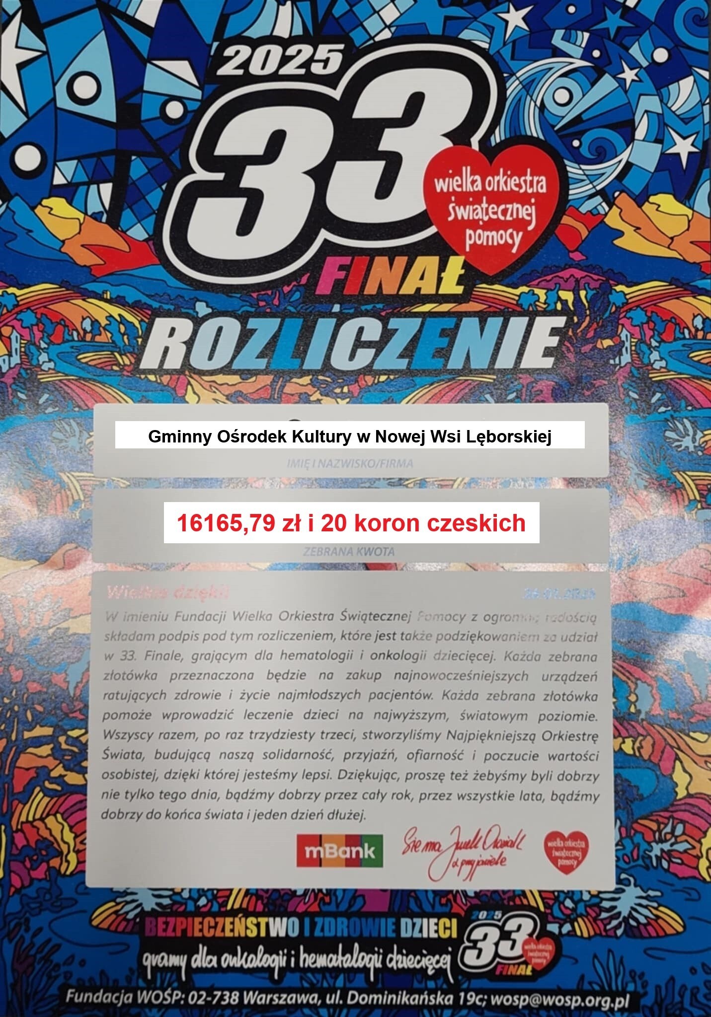Dzięki Waszemu wsparciu wspólnie zebraliśmy kwotę 16165,79 zł i 20 koron szwedzkich