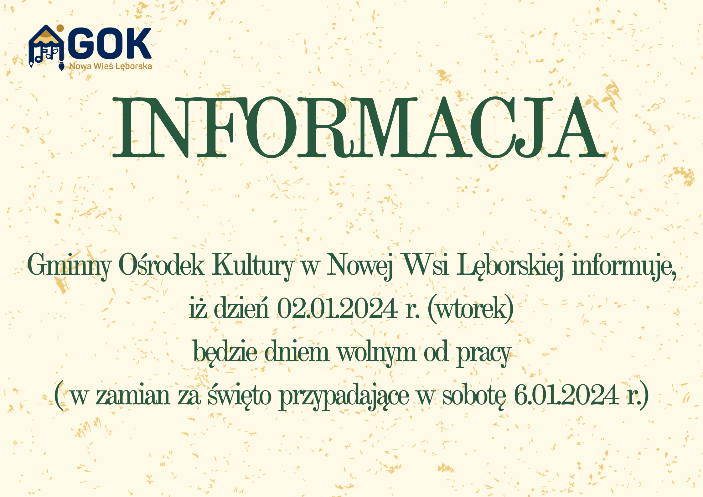 Informujemy, iż Gminny Ośrodek Kultury w dniu 2.01.2024 r. (wtorek)