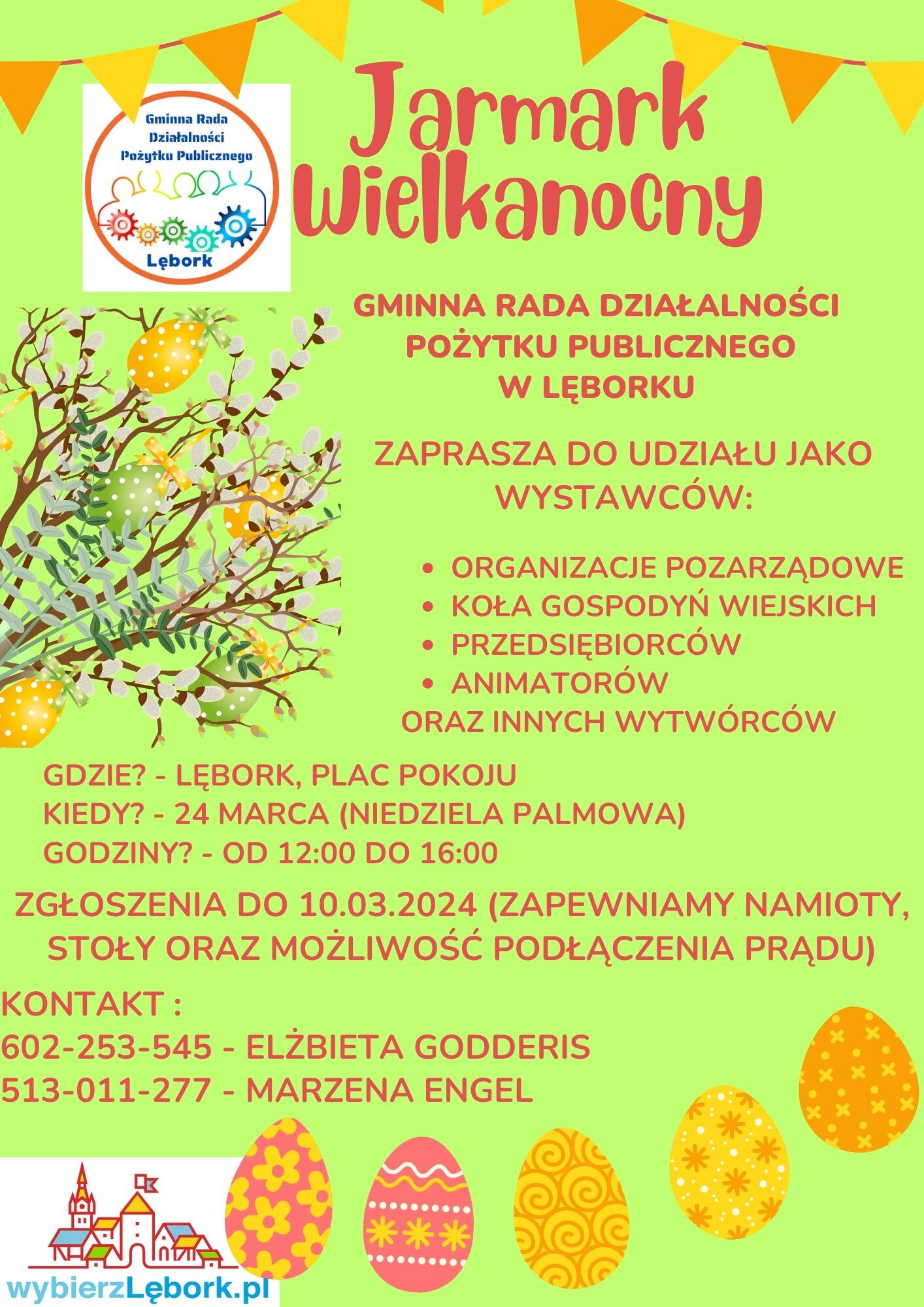 Gminna Rada Działalności Pożytku Publicznego w Lęborku, informuje, iż do dnia 10.03.2024 r. zaprasza organizacje pozarządowe, koła gospodyń wiejskich, przedsiębiorców oraz innych wytwórców do udziału jako wystawców podczas Jarmarku Wielkanocnego w dniu 24 marca (Niedziela Palmowa).