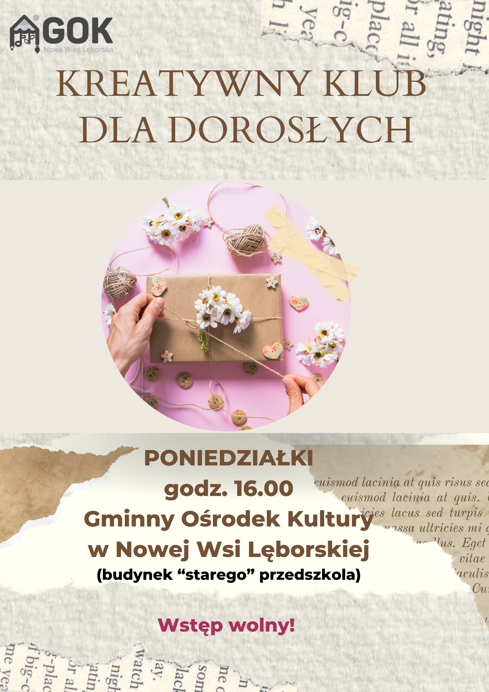 Zapraszamy na pierwsze z cyklu spotkanie kreatywnego klubu dla dorosłych. W poniedziałek 14 października o godz. 16.00 w Gminnym Ośrodku Kultury w Nowej Wsi Lęborskiej. Każde spotkanie będzie rozwijać inne umiejętności, chcemy wspólnie szydełkować, pobawić się makramą, może czasem napisać wiersz, ulepić coś albo zmalować. Wszystko zależy od fantazji naszych prowadzących. Zapraszamy także do tworzenia tych zajęć razem z nami, jeżeli macie ciekawe pasje, to pokażcie je innym.