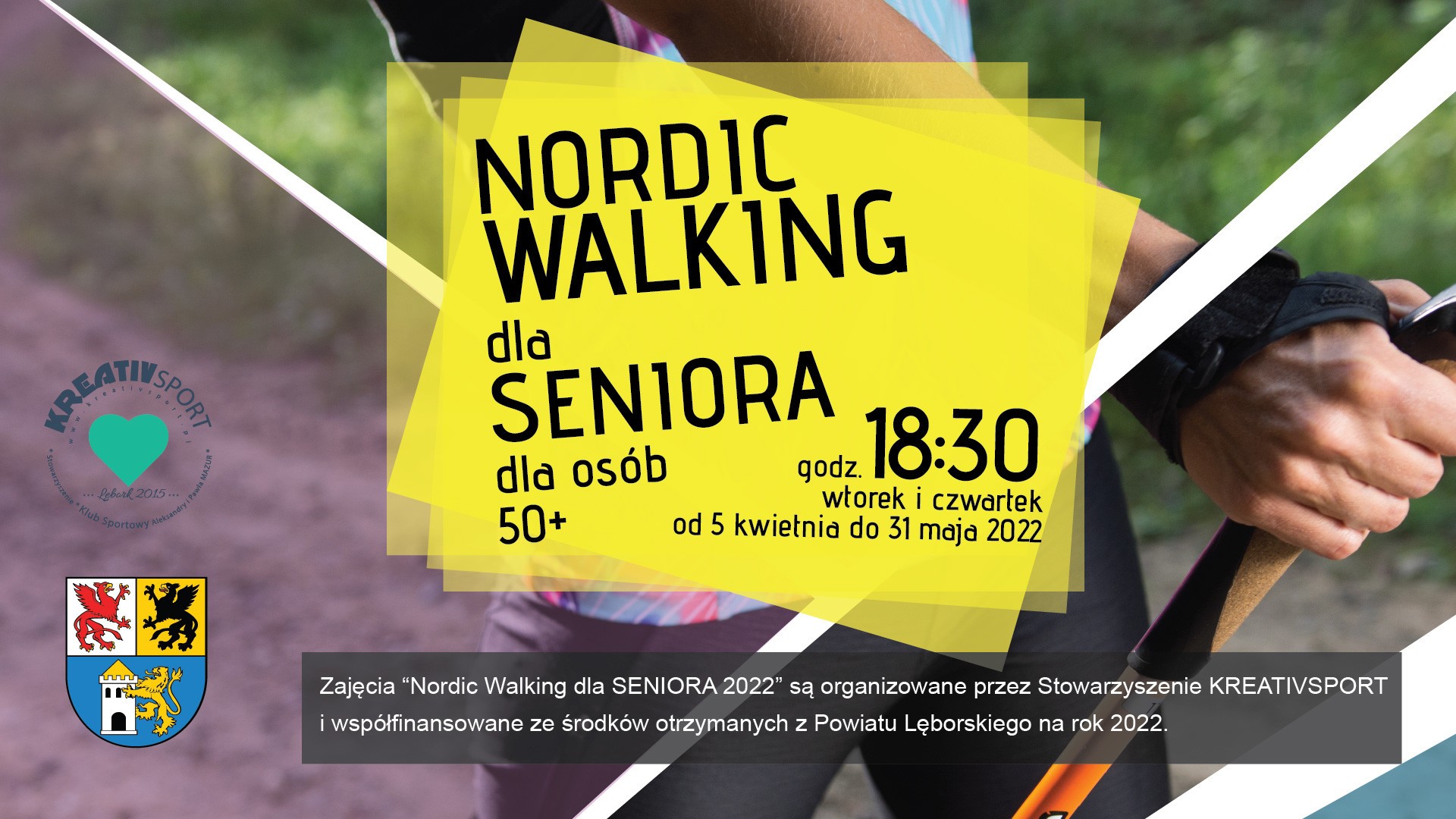 Zajęcia “Nordic Walking dla SENIORA 2022” są organizowane przez Stowarzyszenie KREATIVSPORT i współfinansowane ze środków otrzymanych z Powiatu Lęborskiego na rok 2022.