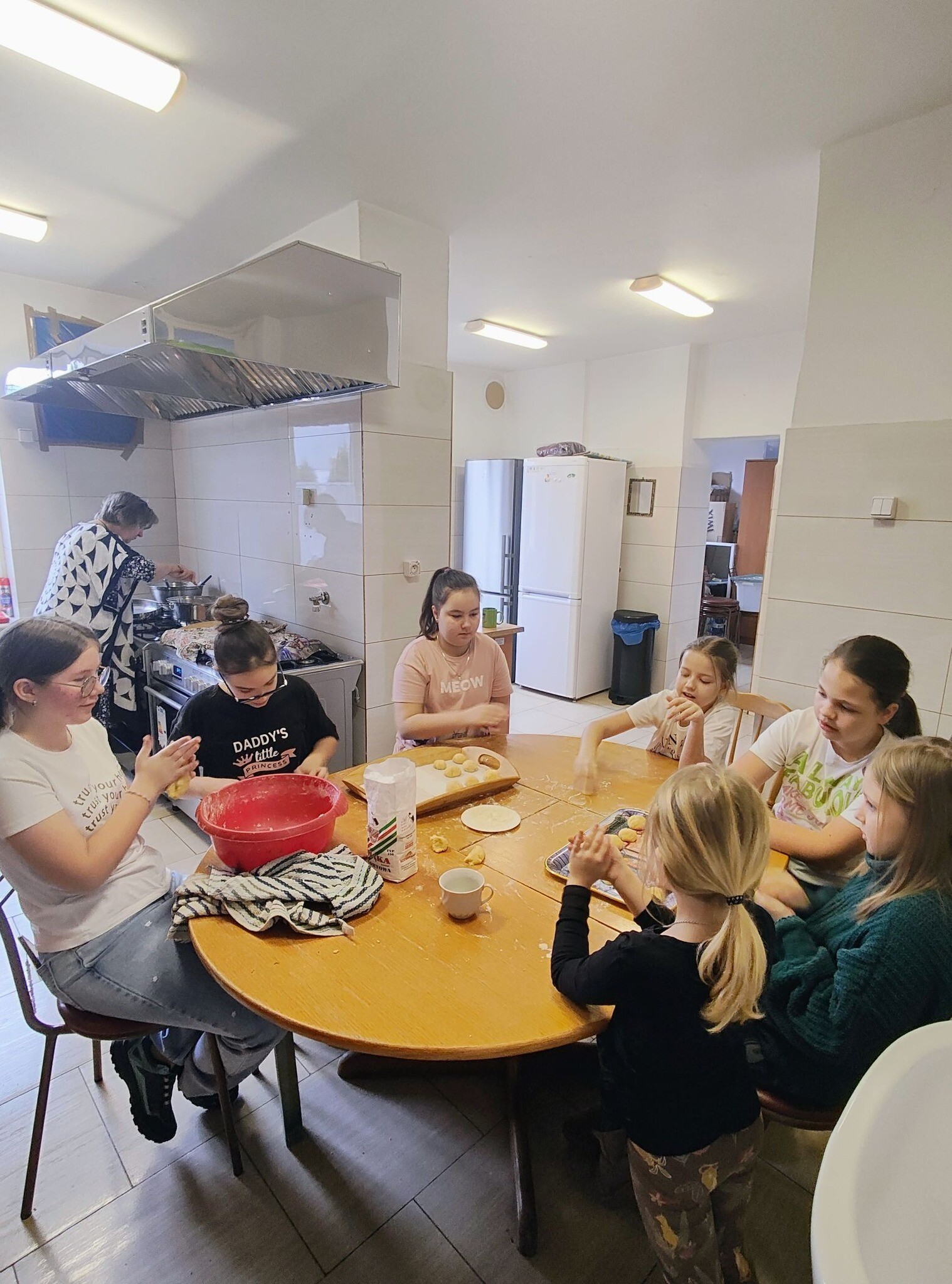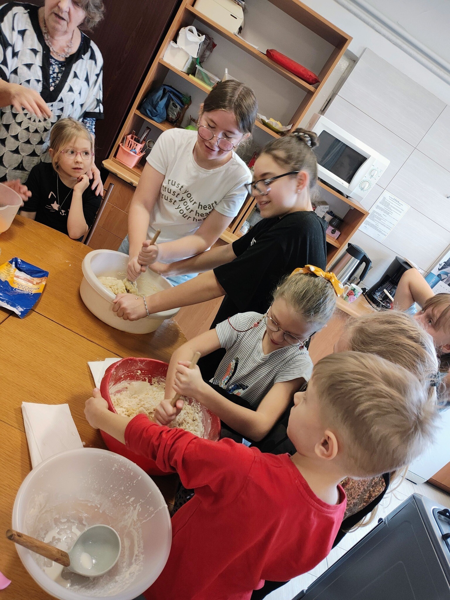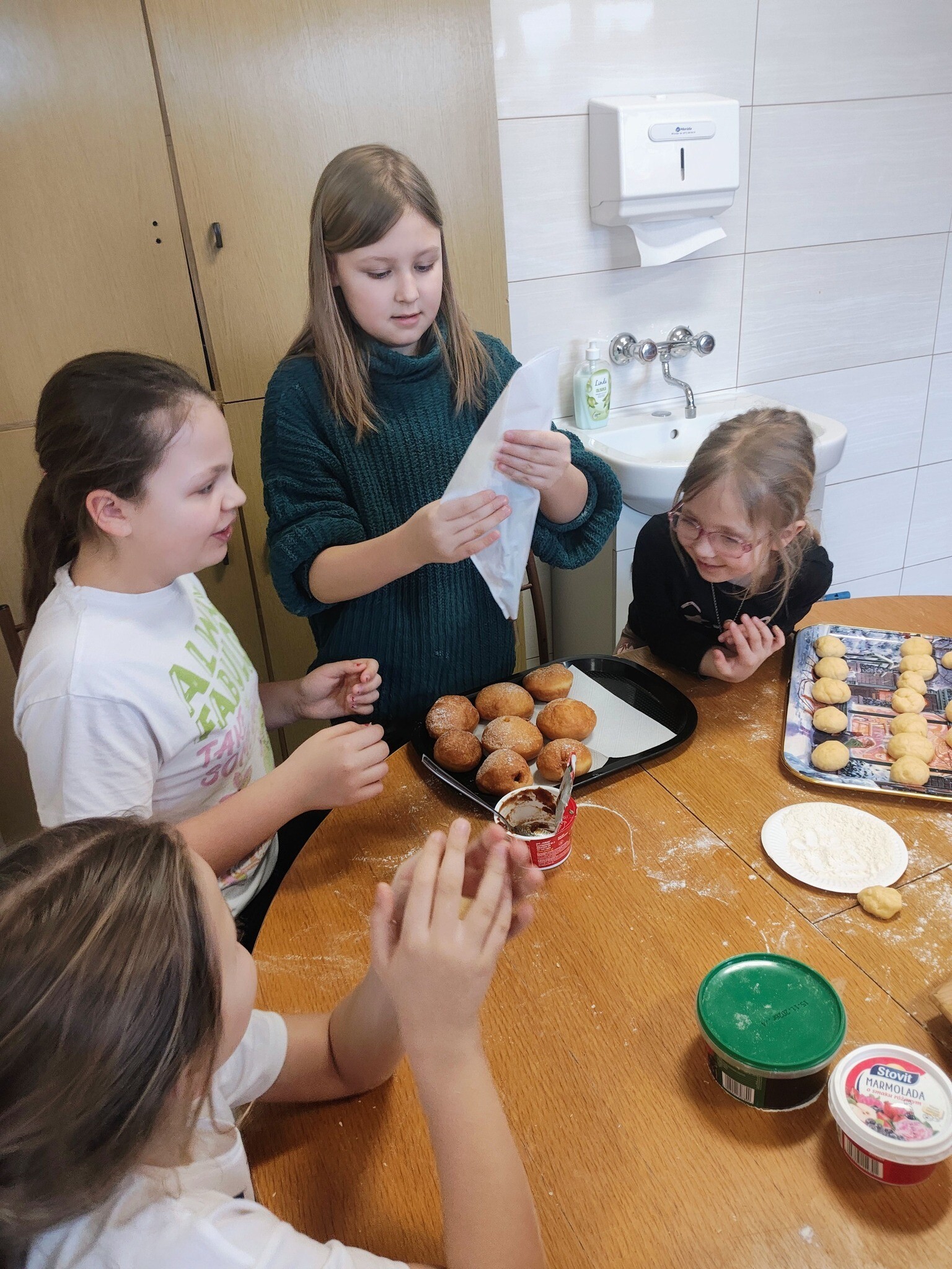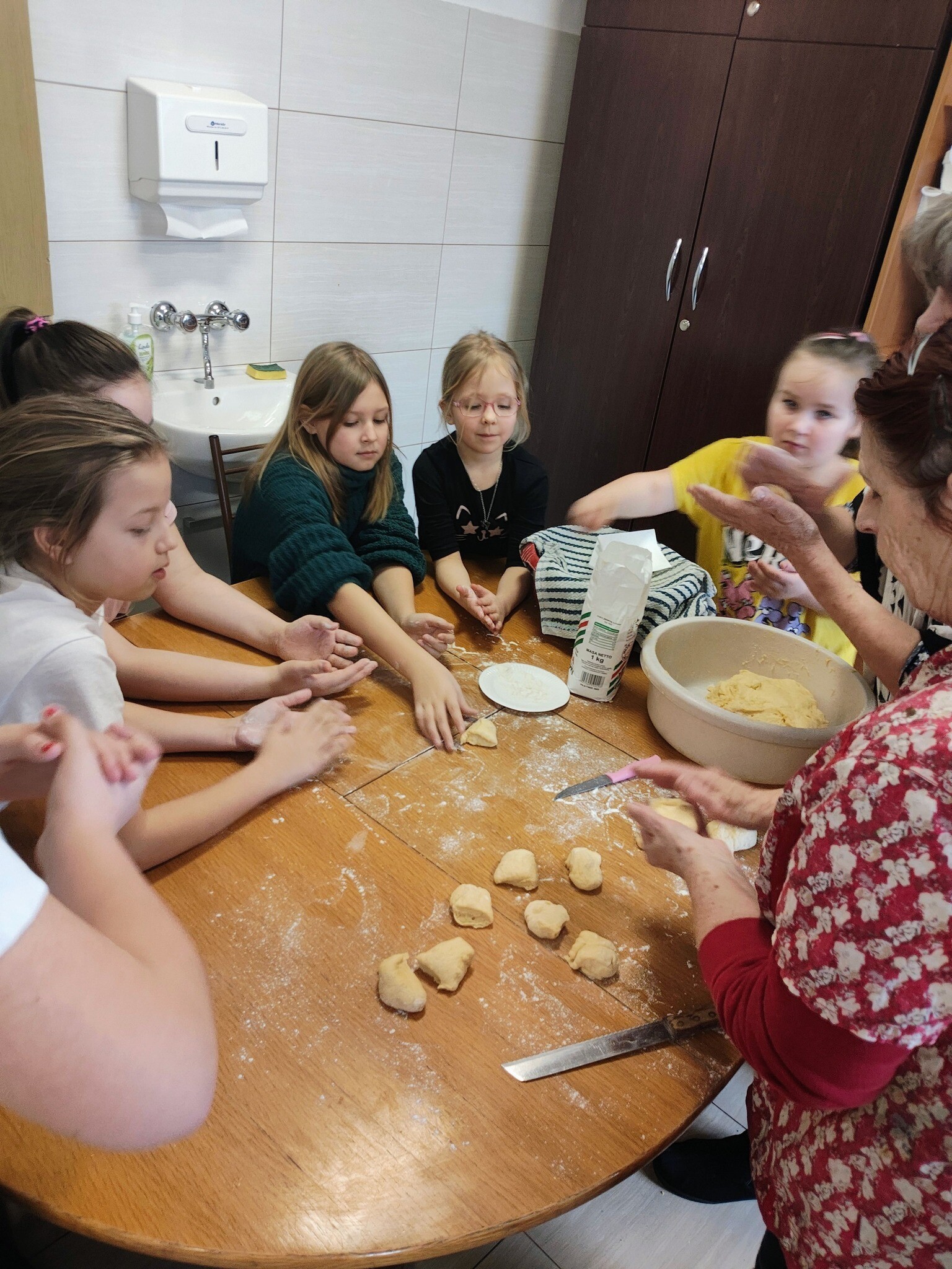 Tłusty Czwartek w GOK. Dzięki pomocy malarek z klubu "Alle babki..." Pani Józefy oraz Pani Hani dzieci miały okazję upiec od podstaw pyszne tradycyjne pączki