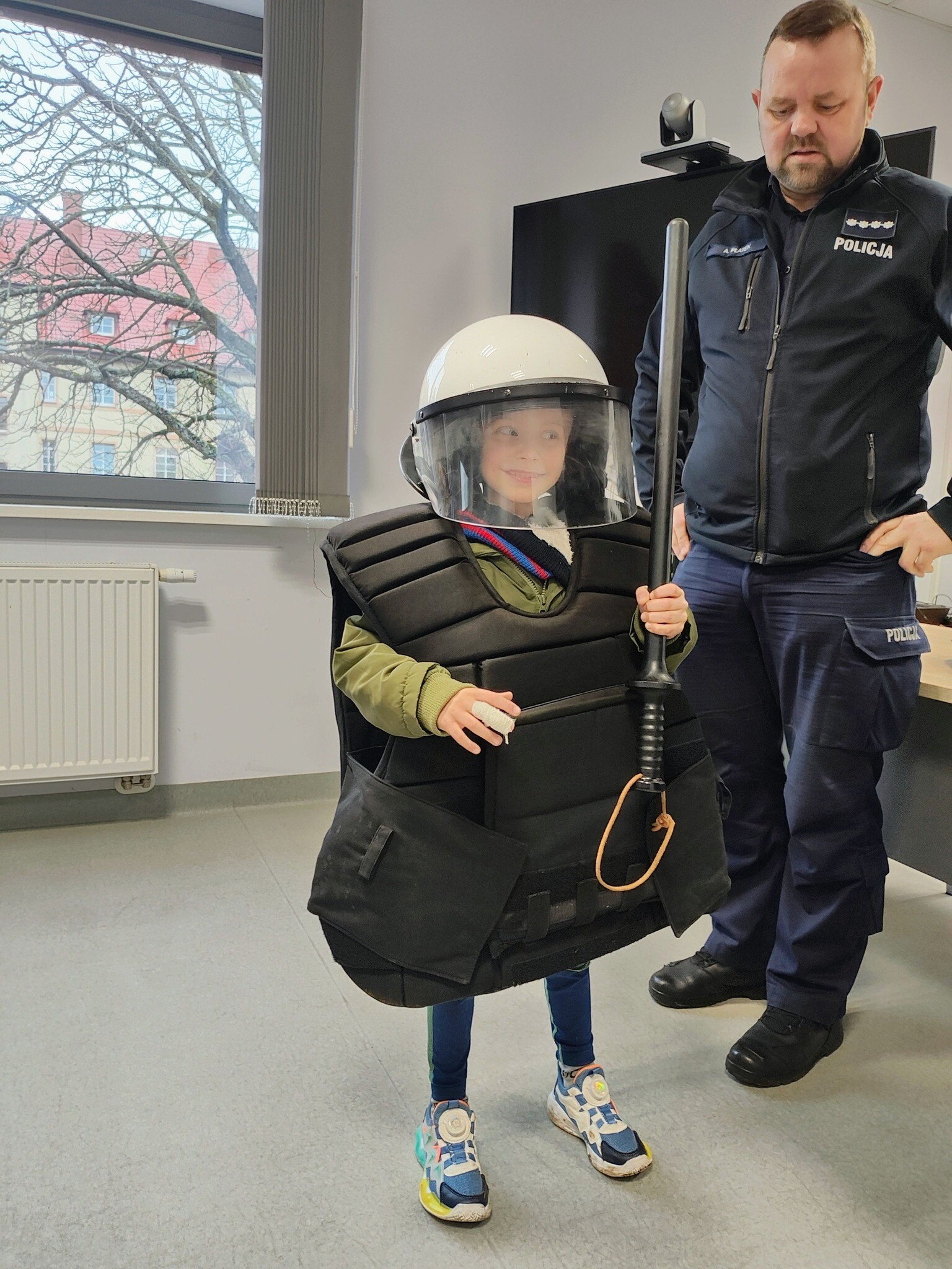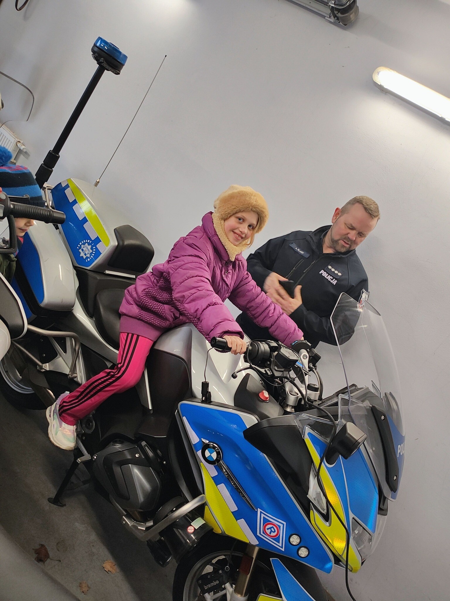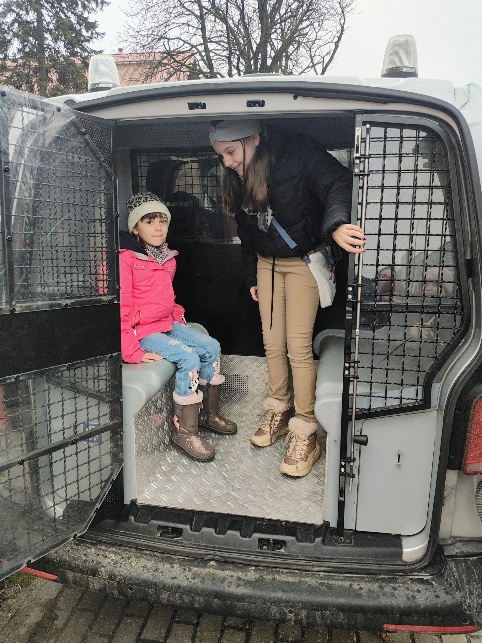 W ostatnim dniu ferii Pan Wojtek Kublik zabrał nas na Komendę Powiatową Policji w Lęborku Funkcjonariusze policji pokazali nam radiowóz którym przewożą podejrzanych oraz motor policyjny. Dzieci miały możliwość założenia ochronnego ubrania, które policjanci zakładają na siebie podczas różnych akcji policyjnych. Widzieliśmy także celę więzienną oraz dyżurkę. Bardzo dziękujemy za możliwość zwiedzania. Na koniec ferii zjedliśmy pyszną pizzę.