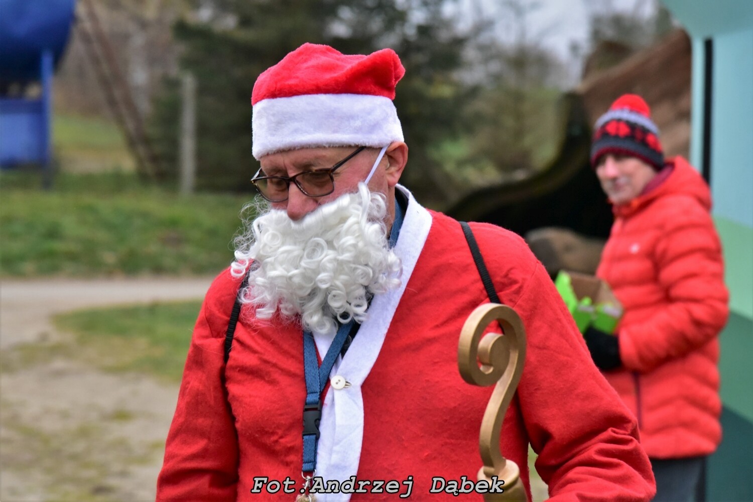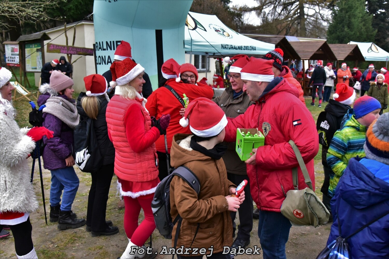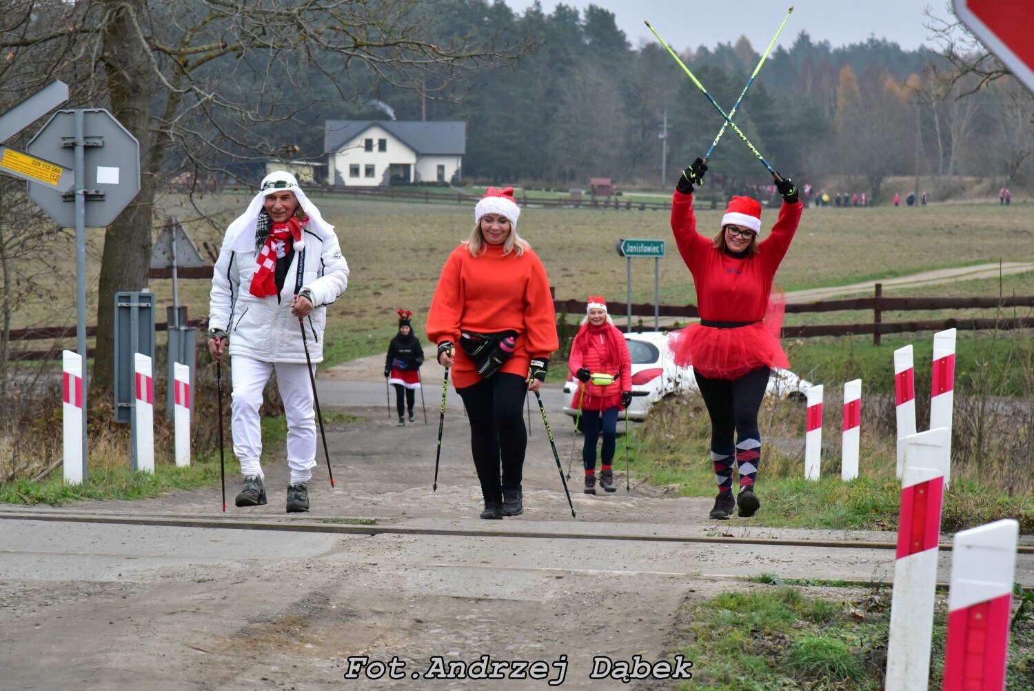 Mikołaje z pełnymi kieszeniami dobrych słodyczy na trasie to wyjątkowy widok i niebywała atrakcja. Na wysokości strumyka idąc w prawo krętą leśną ścieżką pokonaliśmy zróżnicowane podłoża, od twardych, do piaszczystych. Na 2,6 km doszliśmy do starego torowiska, (dawna linia PKP nr 230 łącząca Lębork, Garczegorze z Choczewem), po przekroczeniu którego skręciliśmy w lewo. Napotkaliśmy wybudowanie Jasia i Małgosi. Przechodząc asfaltową drogę pod kontrolą organizatora Jurka doszliśmy do zabudowań dawnego Zakładu Rolnego w Janisławcu, gdzie u Państwa Rompskich Mikołaje mieli do wypicia 40 litrów gorącego kaka prosto z zabytkowej Obory.
