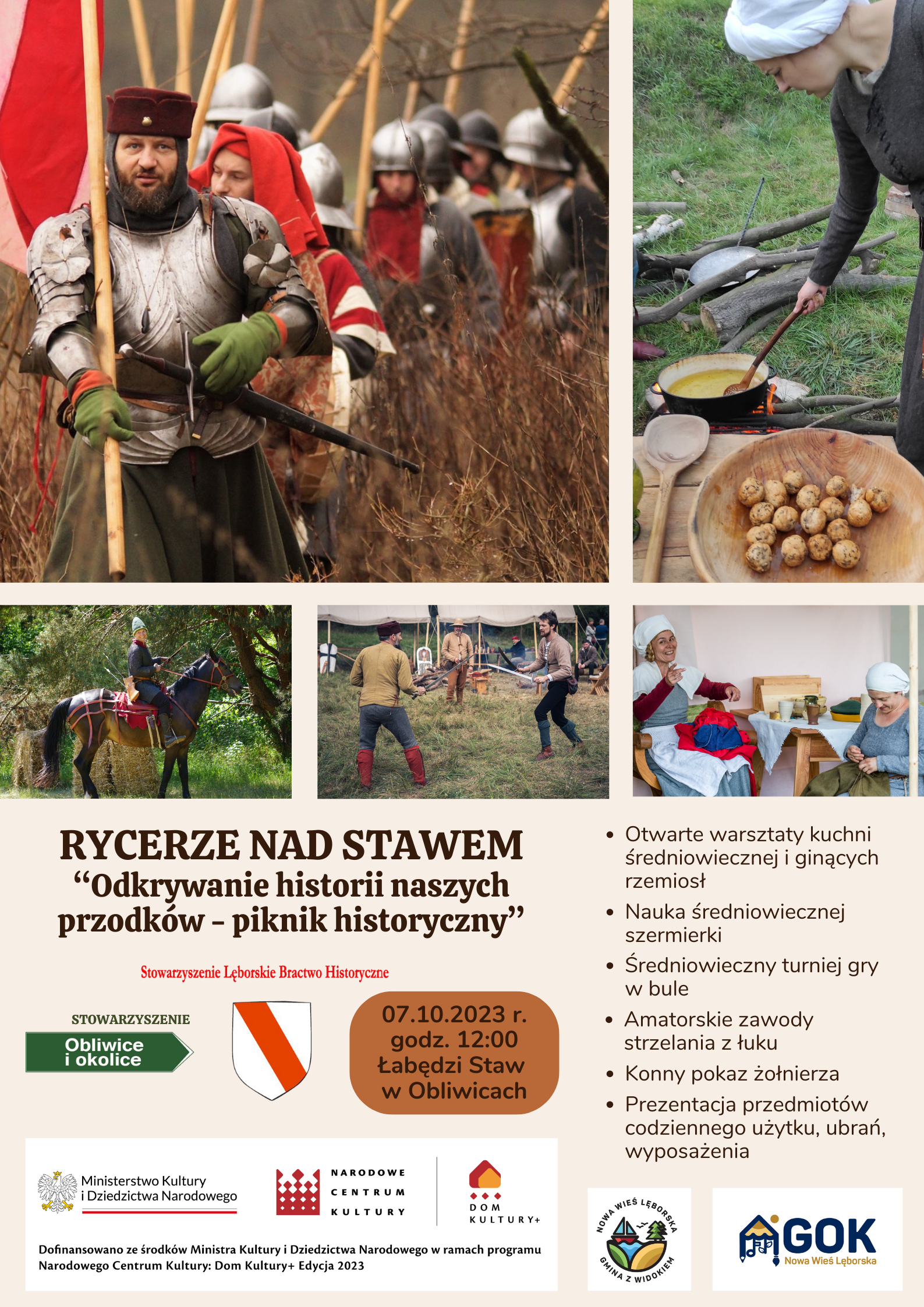 "Rycerze nad stawem. Odkrywanie historii naszych przodków - piknik historyczny" to inicjatywa o charakterze edukacyjno-rekreacyjnym. Centrum wydarzenia stanowić będzie obóz średniowieczny przygotowany przez Stowarzyszenie Lęborskie Bractwo Historyczne.