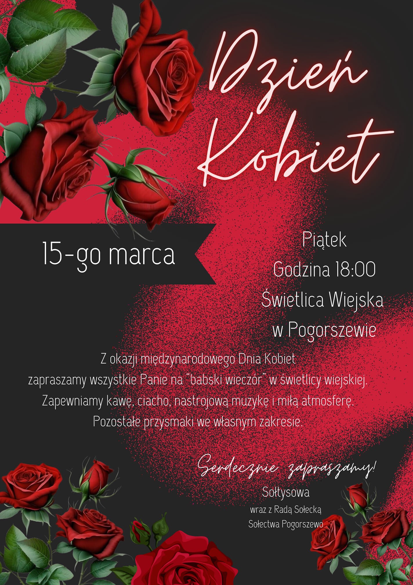 zapisy: 59 8612 113 - 15 marca - godz. 18:00 - Dzień Kobiet w Sołectwie Pogorszewo (świetlica wiejska)