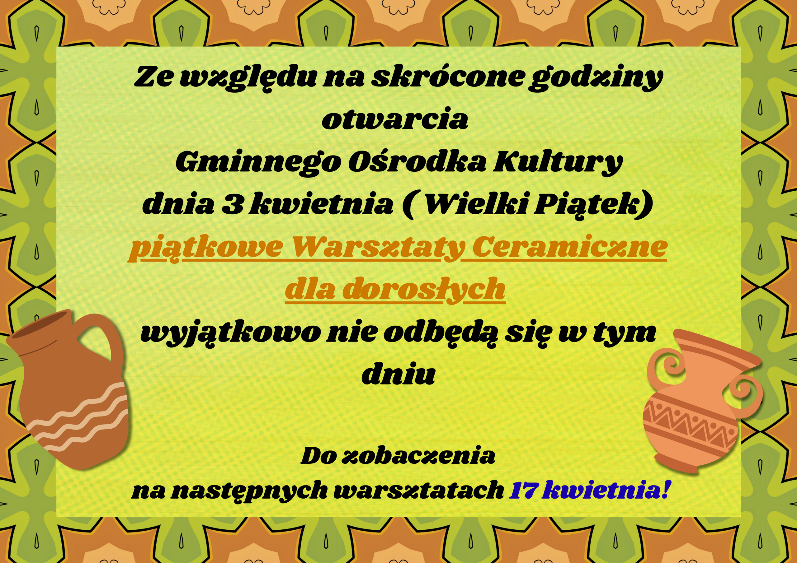 - Warsztaty ceramiczne dla dorosłych - brak zajęć dnia 3 kwietnia ( Wielki Piątek)