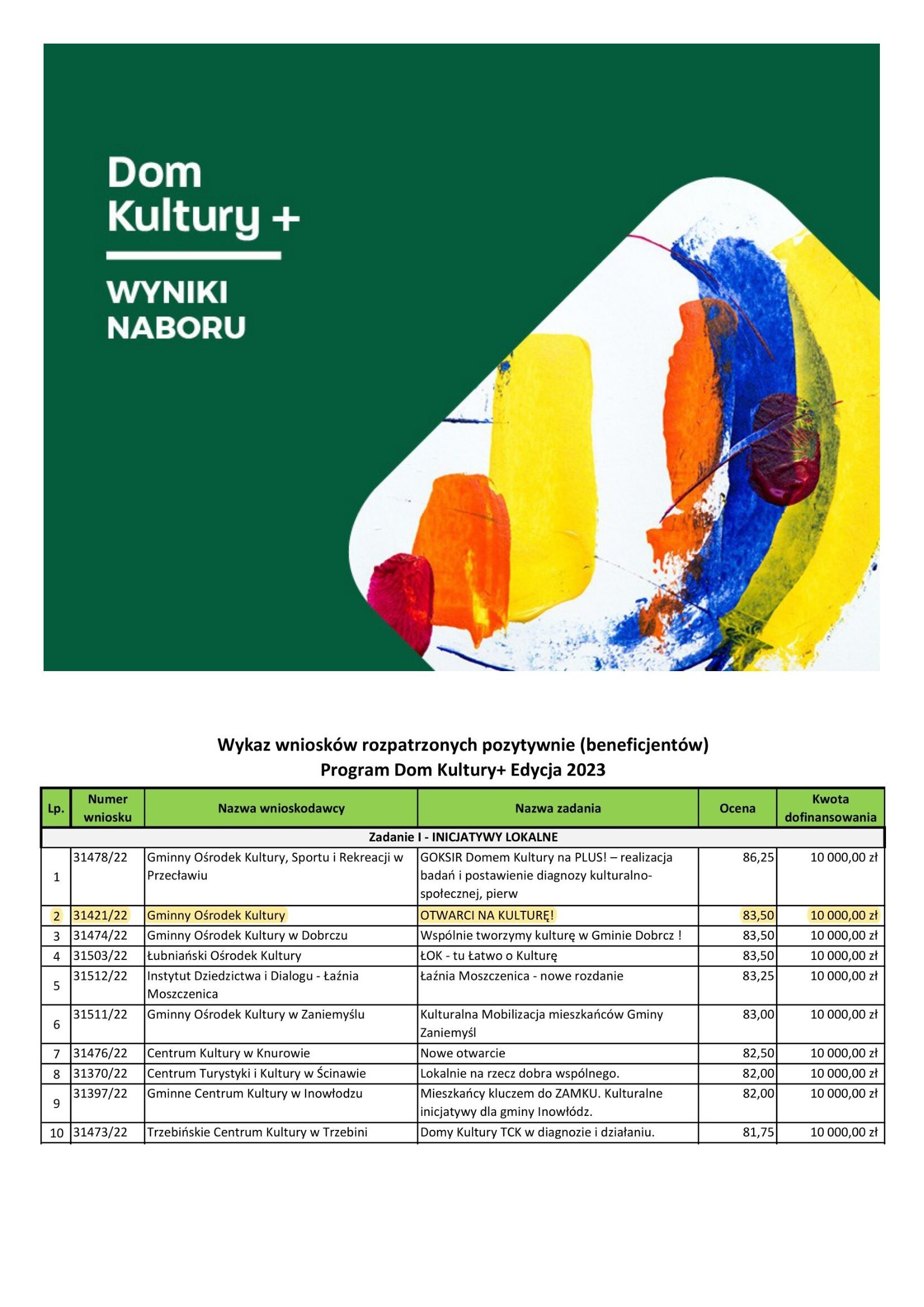 Z przyjemnością informujemy, że nabór został rozstrzygnięty, a Gminny Ośrodek Kultury w Nowej Wsi Lęborskiej zajął 2 miejsce na liście zakwalifikowanych projektów.
