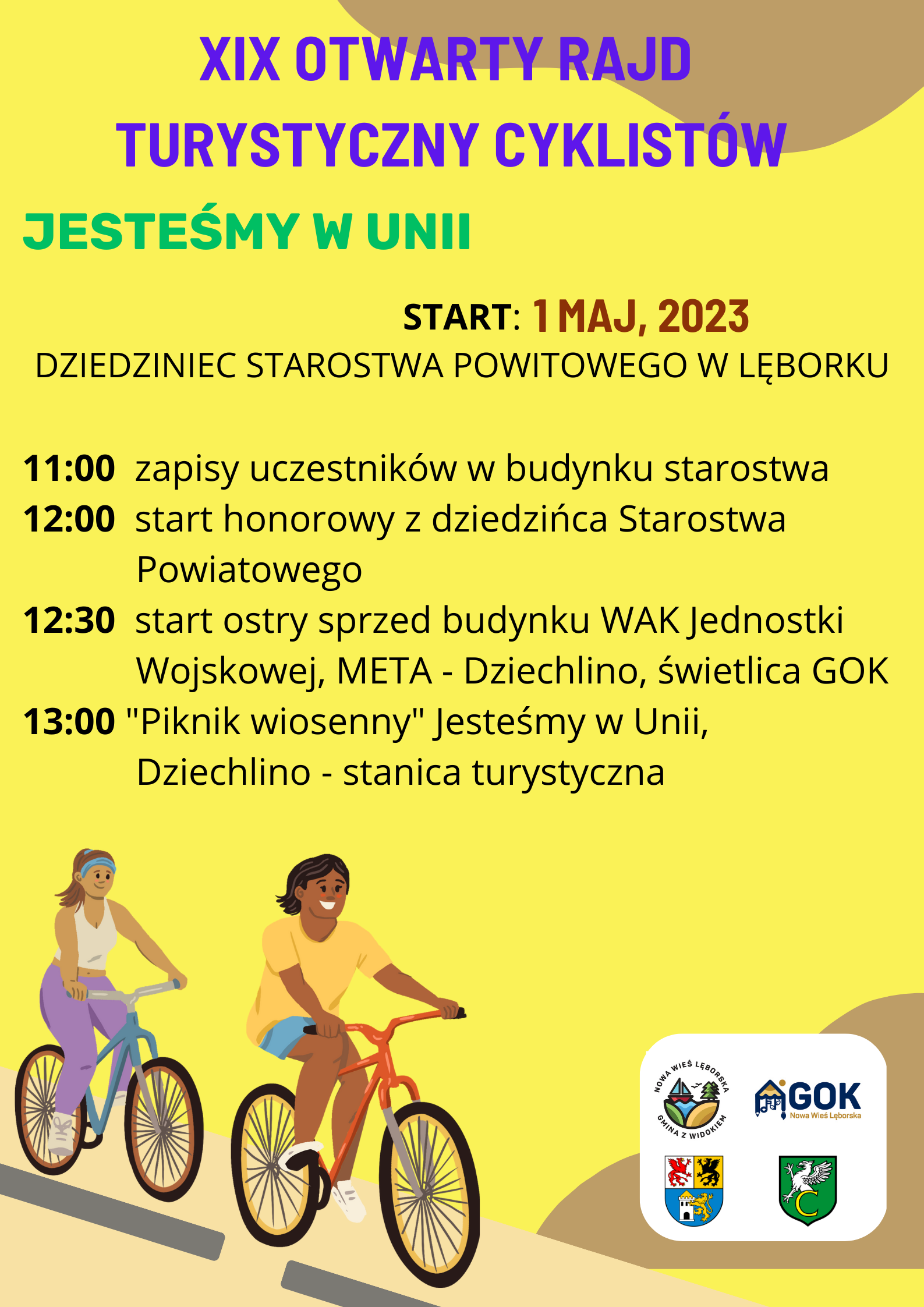 Zapraszamy do udziału w XIX Otwartym Rajdzie Turystycznym Cyklistów. Start 1 maja br. Zapisy od godz. 11:00 w budynku Powiat Lęborski. Meta w stanicy turystycznej Dziechlinie. O 13:00 "Piknik wiosenny" Jesteśmy w Unii.