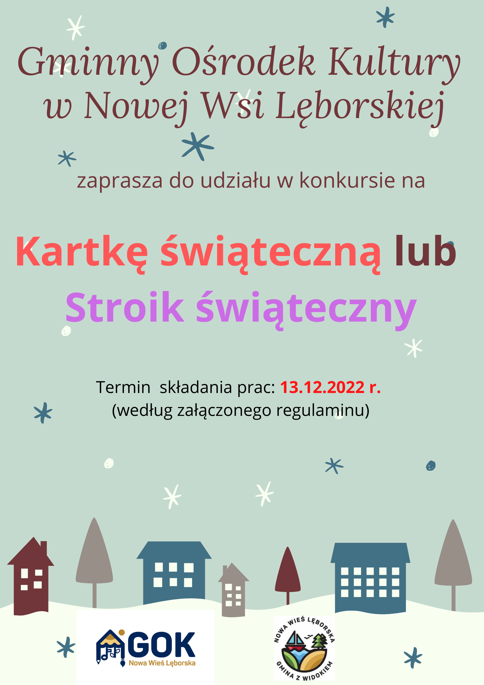 Gminny Ośrodek Kultury w Nowej Wsi Lęborskiej zaprasza do wzięcia udziału w konkursie Świątecznym na "Kartkę świąteczna lub stroik świąteczny". Termin składania prac 13.12.2022 według załączonego regulaminu.