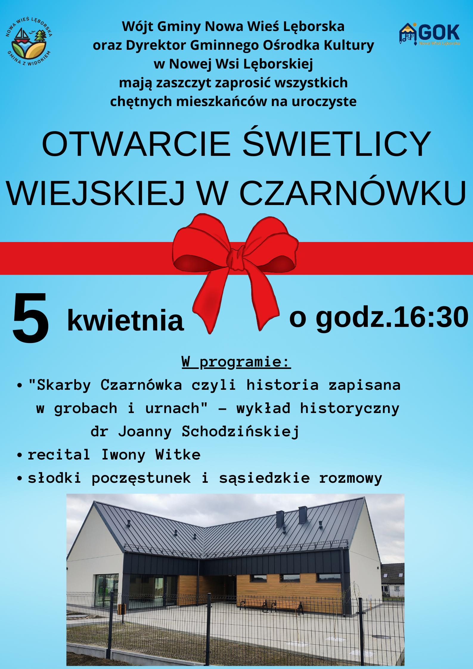 Na uroczystość zapraszamy chętnych mieszkańców, a w programie: wykład historyczny dr Joanny Schodzińskiej "Skarby Czarnówka czyli historia zapisana w grobach i urnach", recital Iwony Witke oraz rozmowy sąsiedzkie przy słodkim poczęstunku.