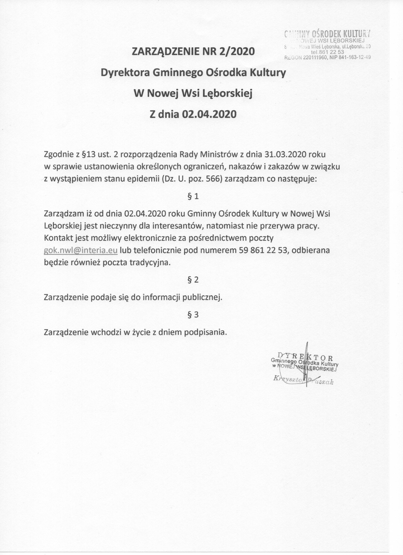 - Zarządzenie Dyrektora Gminnego Ośrodka Kultury w Nowej Wsi Lęborskiej z dnia 2.04.2020