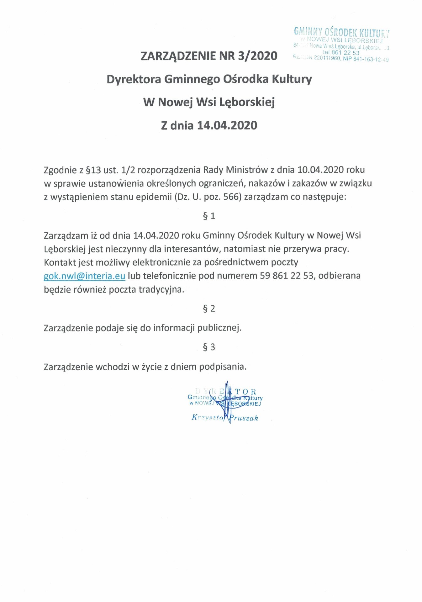 - Zarządzenie nr 3 Dyrektora Gminnego Ośrodka Kultury w Nowej Wsi Lęborskiej