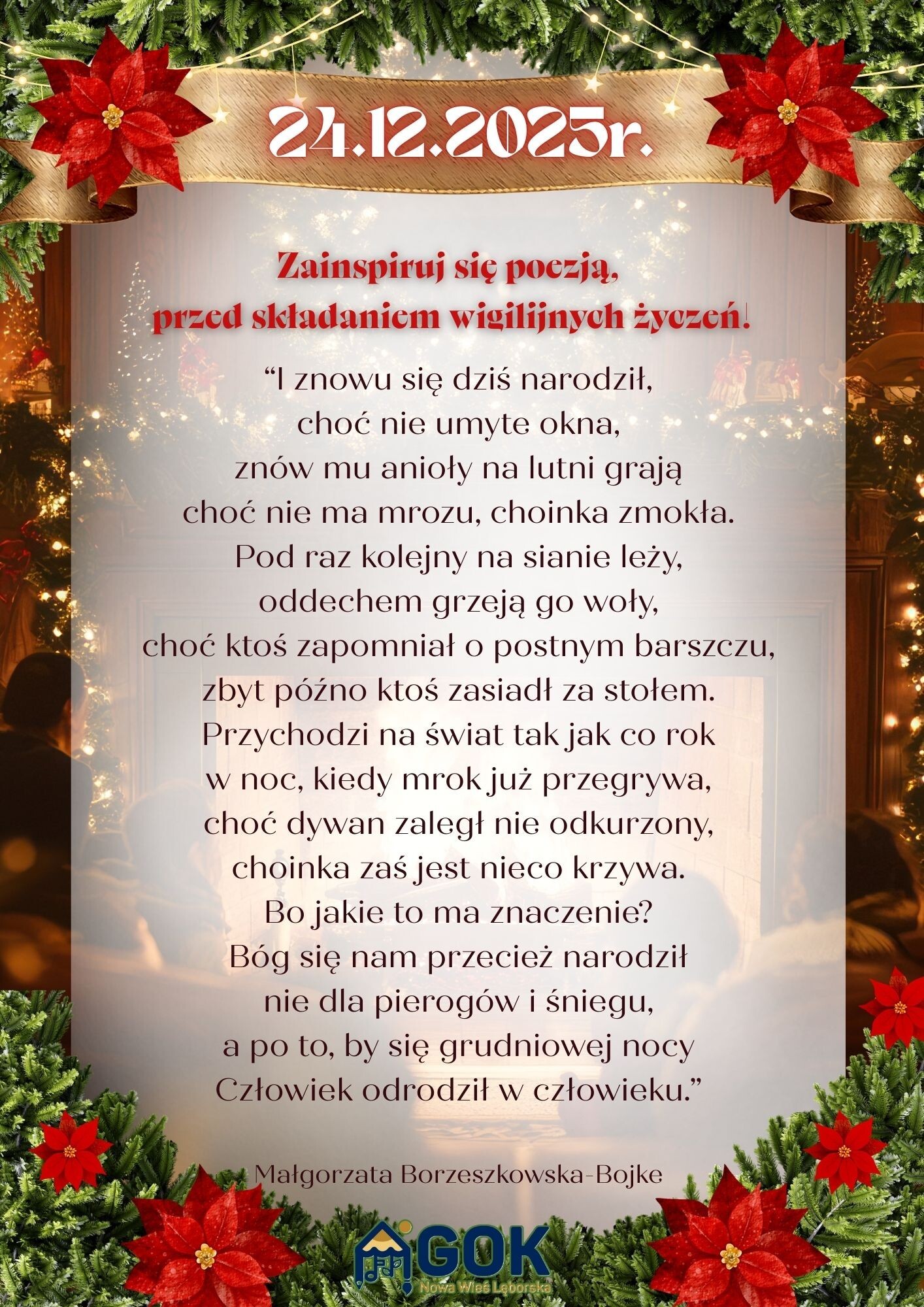Wiersz Małgorzaty Borzeszkowskiej to upominek od całego zespołu Gminnego Ośrodka Kultury w Nowej Wsi Lęborskiej, który życzy naszym przyjaciołom, uczestnikom zajęć i spotkań, pasjonatom, działaczom skupiającym się w naszych progach - aby te święta rozwinęły w Was radość z tworzenia, działania i dzielenia się z innymi swoimi pasjami, zaangażowaniem, dobrym słowem i życzliwością. Twórzcie piękno wokół siebie.