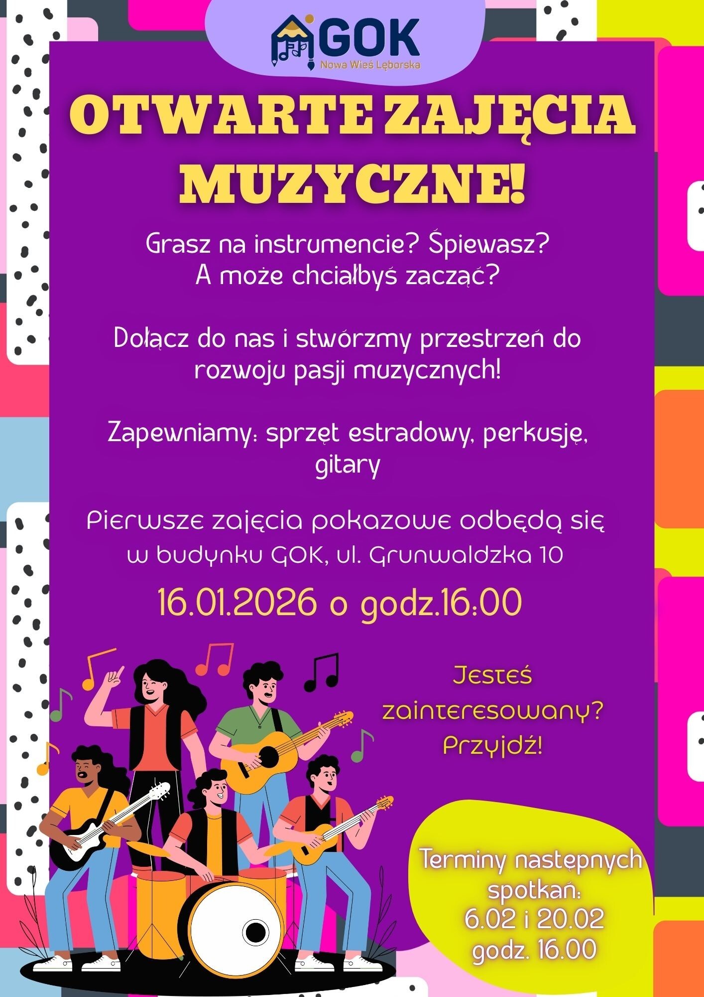 Gminny Ośrodek Kultury w Nowej Wsi Lęborskiej zaprasza dzieci, młodzież i dorosłych na otwarte zajęcia muzyczne prowadzone przez muzyka i pasjonata Darka Rostalskiego. To doskonała okazja, by spróbować swoich sił w muzyce, rozwinąć pasję, poznać nowe instrumenty i poczuć radość wspólnego muzykowania – bez zobowiązań i bez względu na poziom zaawansowania.